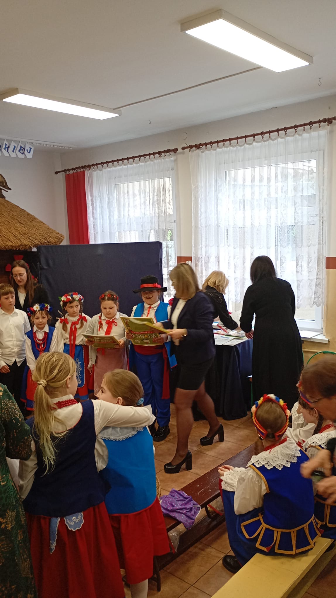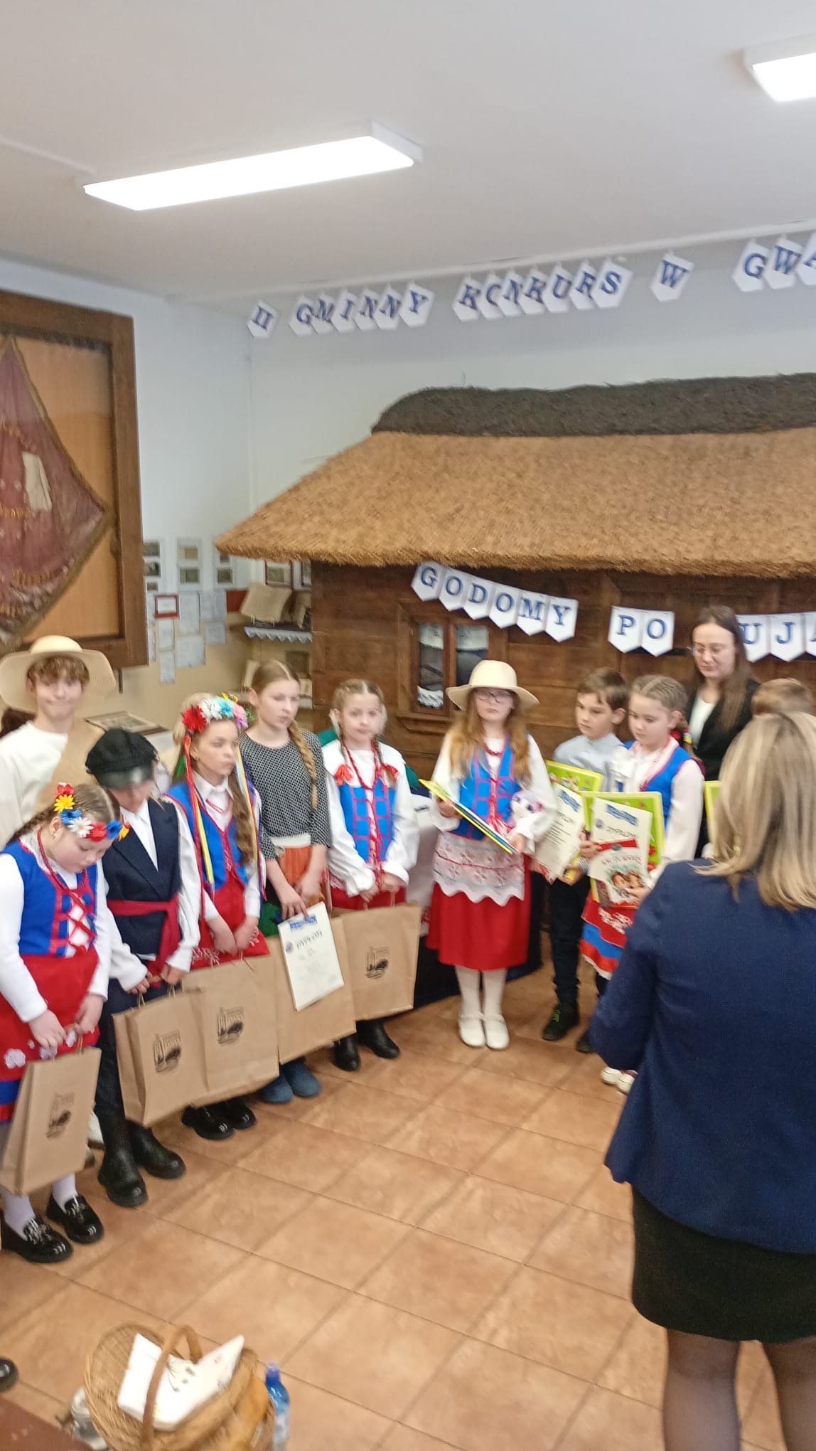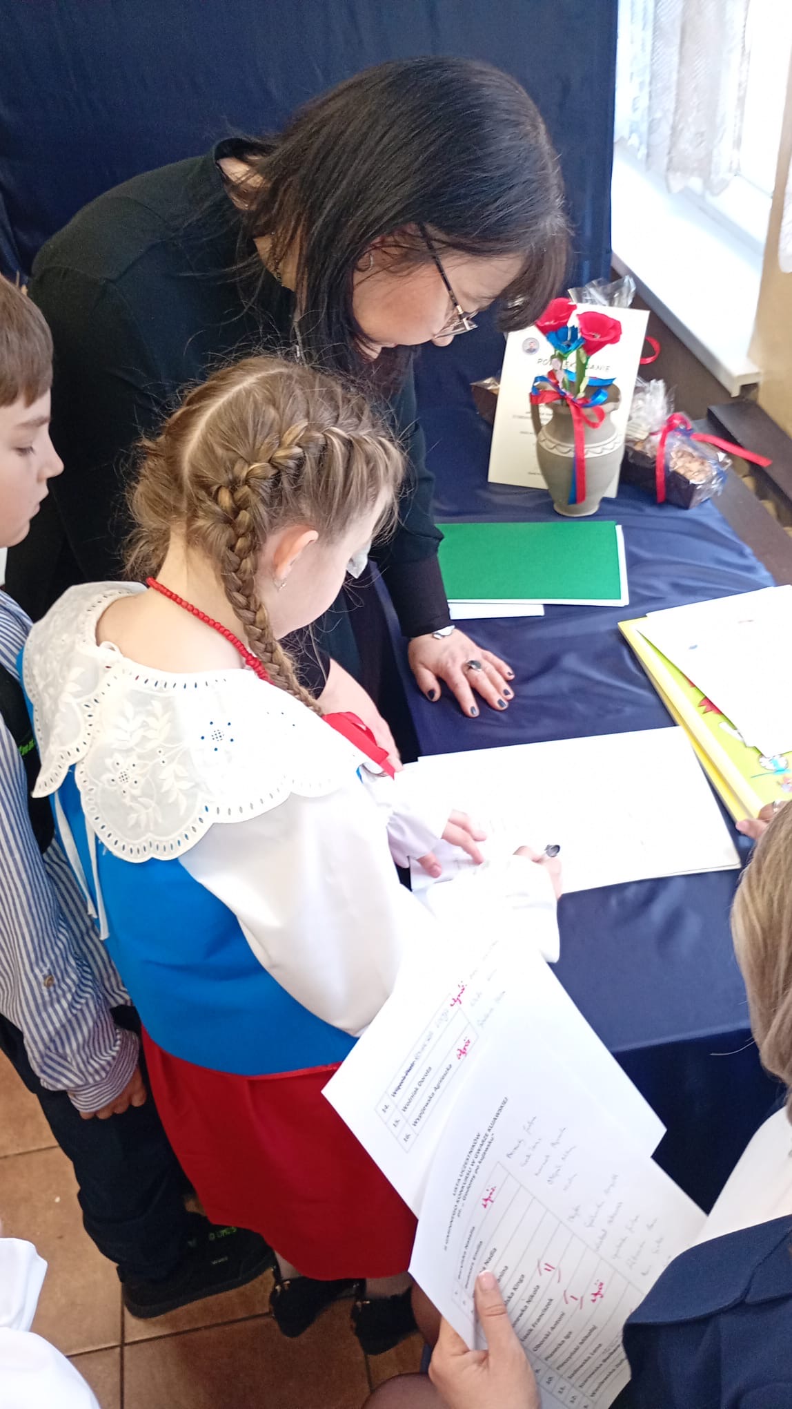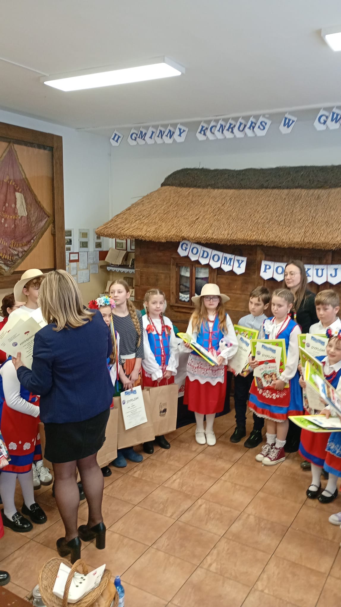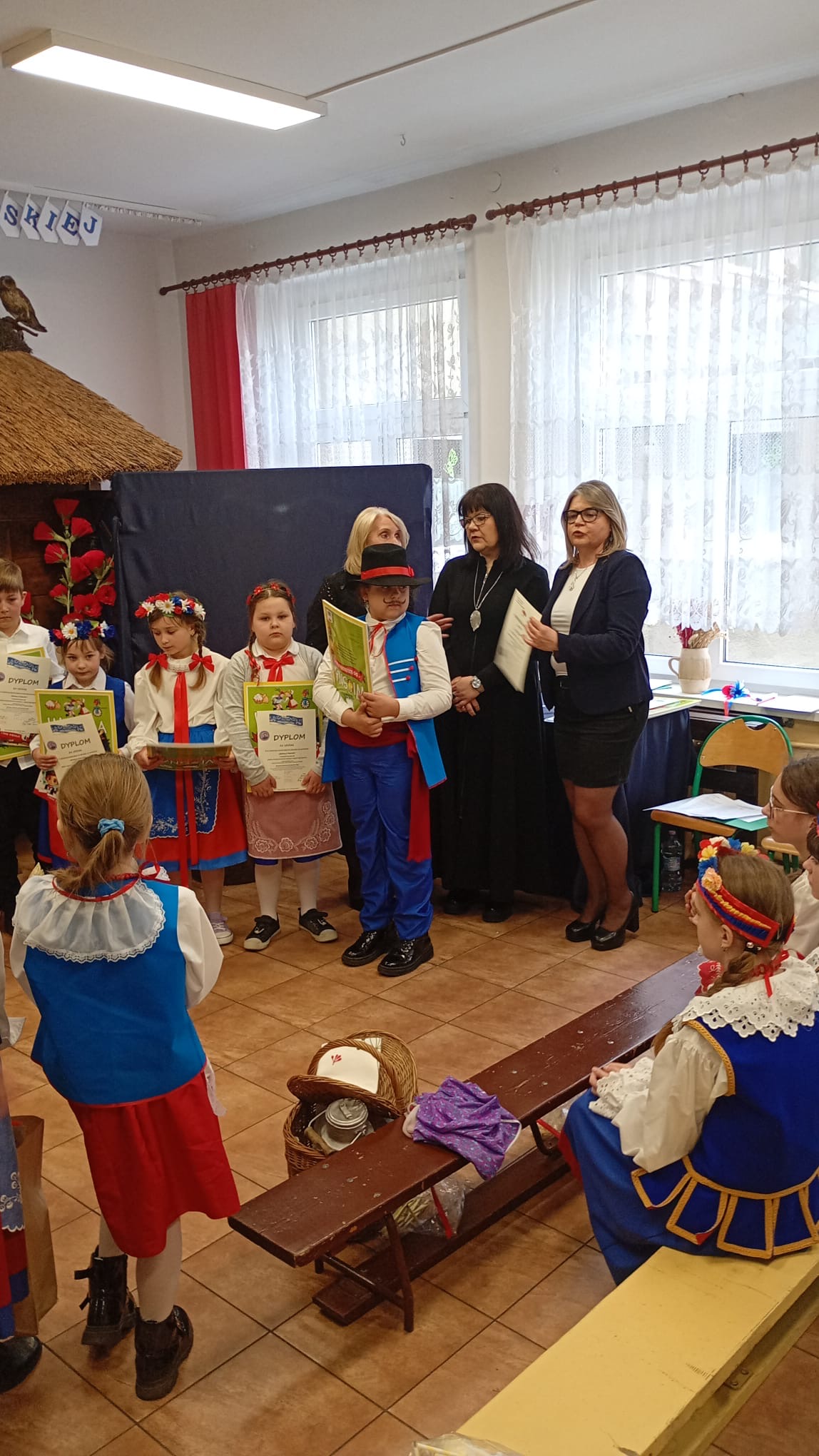 Kto powiedział, że gwara jest trudna? Nasze uczennice z klasy pierwszej udowodniły ,że kujawska mowa brzmi pięknie w każdym wieku. W minioną sobotę 11.04.2026 roku Ulka Szarowska i Dorotka Woźniak dumnie reprezentowały naszą szkołę w II GMINNYM KONKURSIE W GWARZE KUJAWSKIEJ ,,Godomy po kujawsku”, który odbył w Sławsku Wielkim. Z radością informujemy, że Ulka zajęła III miejsce! Warto podkreślić, że to już jej drugi sukces w ciągu zaledwie dwóch tygodni. Ula wyraźnie złapała ,, wiatr w żagle’’ i świetnie czuje się na scenie. Dorotka również zaprezentowała się bardzo ładnie, wykazując się dużą dbałością o kujawskie słownictwo i świetną interpretację tekstu. Nasze młode recytatorki zachwyciły na scenie nie tylko znajomością gwary, ale również przepięknymi, tradycyjnymi strojami kujawskimi, które dodały ich występom wyjątkowego blasku. W oczekiwaniu na werdykt jury pierwszoklasistki wzięły udział w warsztatach. Czekały też na nie słodkie przekąski oraz tradycyjny, kujawski żurek. Wielkie brawa dziewczynki! Życzymy wytrwałości i powodzenia w następnych recytatorskich zmaganiach!